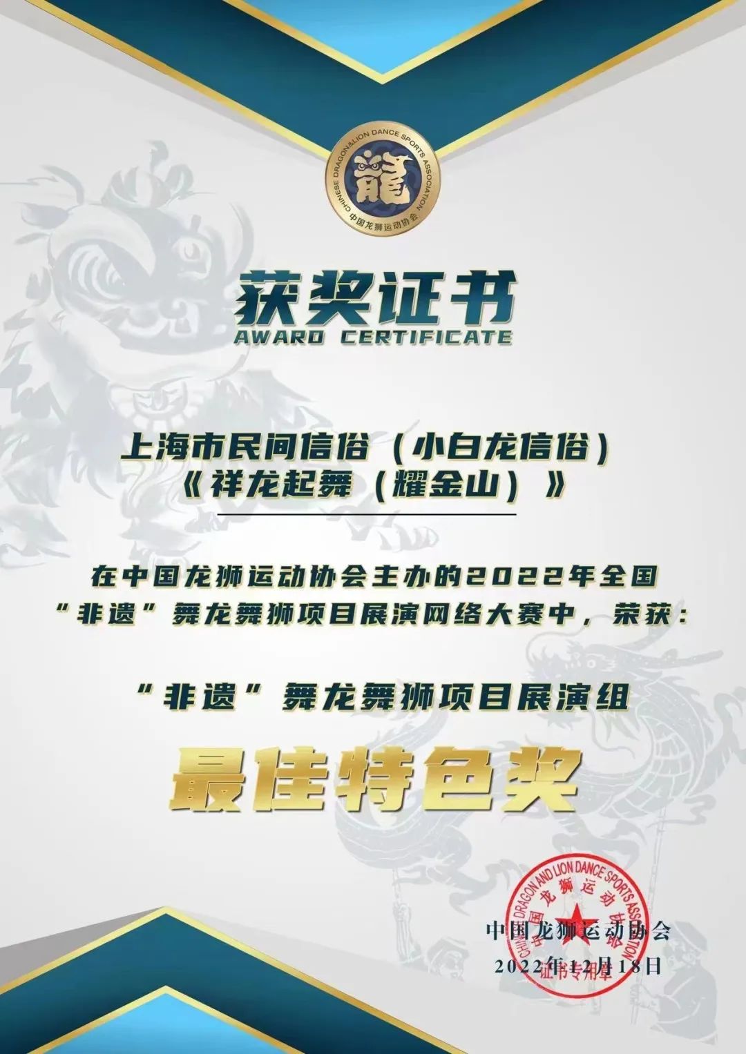 近日,2022年全國“非遺”舞龍舞獅項目展演網絡大賽成績公告,其中上海市民間信俗(小白龍信俗)——祥龍起舞(耀金山)獲最佳特色獎。