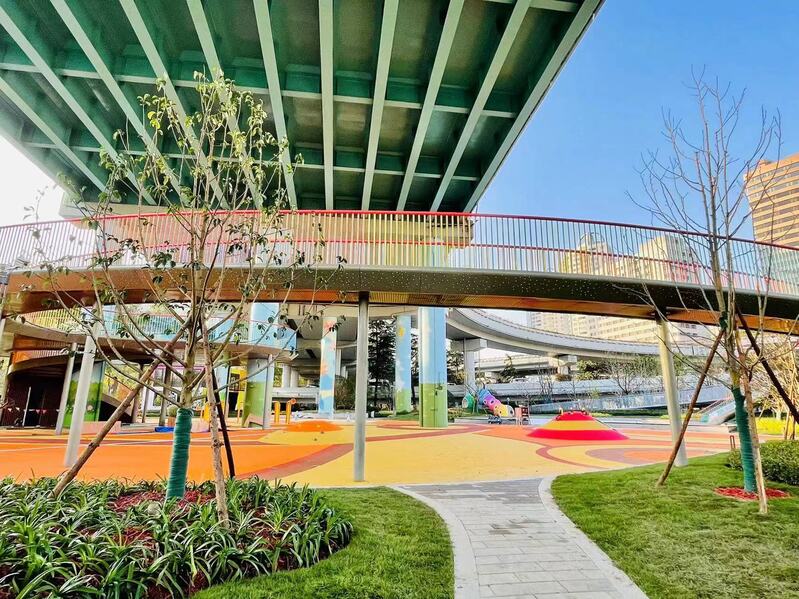 藏在“毛毛蟲”肚子里的滑梯、透水瀝青地面上隆起的“彩虹軟糖”坡道、兩層集裝箱改建的卡通親子驛站……今年11月中旬建成的樂匯小游園童趣盎然,年底前投入使用,一些市民逛完對面的宜家商場,走100多米,到這里遛娃、歇腳。