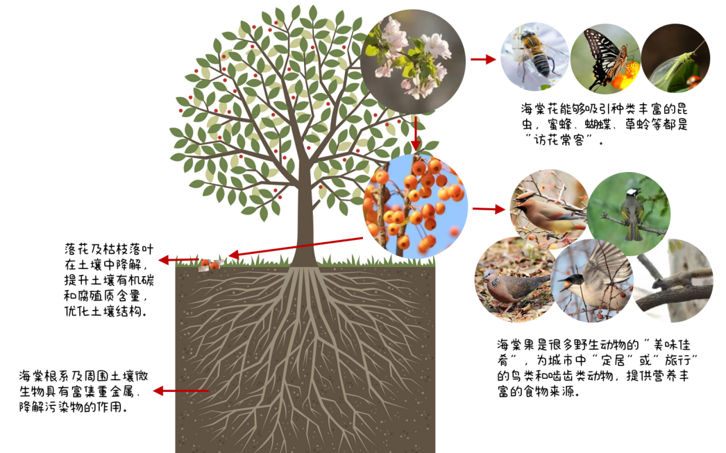 許多鳥類喜愛海棠果實,寒冷季節仍掛在枝頭的一些余果能為野生動物提供越冬的食物資源。春季,各種海棠花能吸引蜜蜂、草蛉等訪花昆蟲。密植的海棠林還能為小動物提供躲避空間。