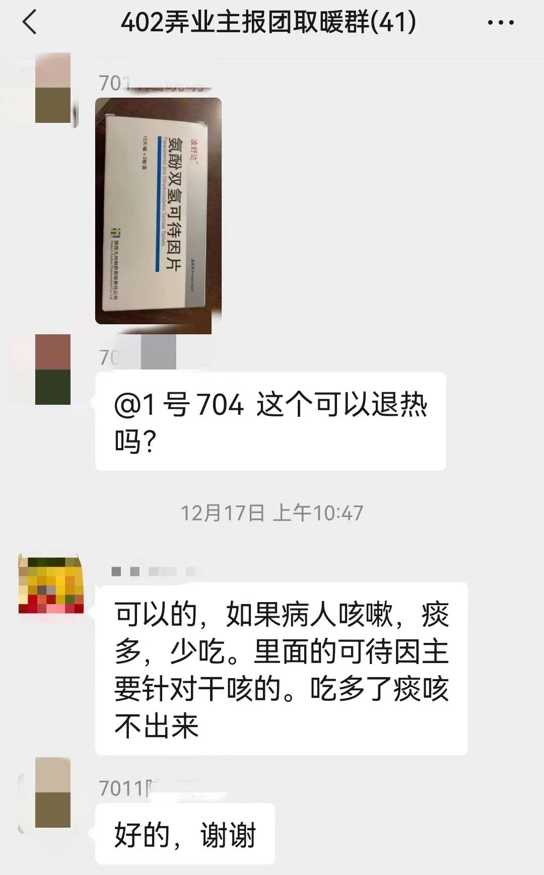 “平時吃菲洛地平緩釋片降壓藥,可以同時吃布洛芬嗎?”“不建議吃,你用冰袋物理降溫。退燒藥吃了幾個小時了?……”有的居民本身存在基礎病,用藥更需謹慎,錢醫生化身“健康聯絡員代表”,由她在業主群里回復。