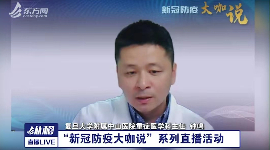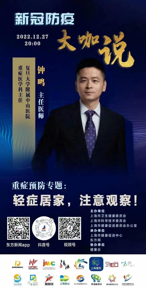 12月27日晚,復旦大學附屬中山醫院重癥醫學科主任鐘鳴在線與網友交流,帶來一場《輕癥居家,注意觀察!》的直播講座。這是由上海市衛生健康委員會、上海市科學技術委員會、上海市健康促進委員會辦公室主辦,上海市健康促進中心和東方網聯合承辦的“新冠防疫大咖說”系列直播活動的第二場。