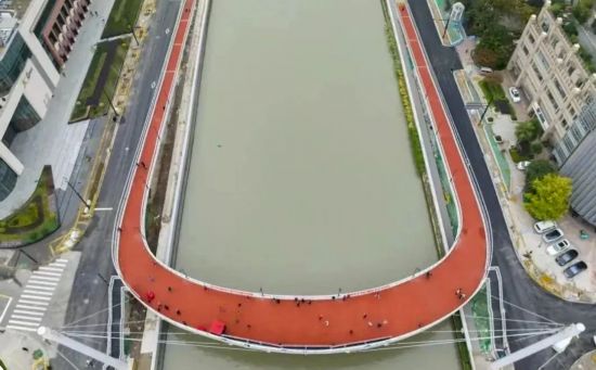 C形橋身漂浮于蘇州河上空,結合場地通過彎曲寬窄變化,成為連接兩岸的關鍵紐帶,方便步行、非機動推行、無障礙等不同需求的人群使用,為市民提供公共活動空間的同時,也為蘇州河又增加一處近可觀、遠可賞的景觀橋和打卡地。