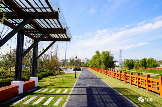 寶山區新建4條綠道,分別為外環林帶綠道(水產路北側、依蘭路東側)、蕰藻浜綠道(共和新路-通河路)、顧村大居拓展基地一期綠道(尚北路、厚仁路)和長江西路南側綠道(共和新路-三泉路),全長共計7.34公里。綠道增加色葉植物的應用,季相景觀豐富,同時進行了功能完善,增設標牌、燈光、座椅等便民服務設施,通過綠道系統,釋放出更多公共開放空間。