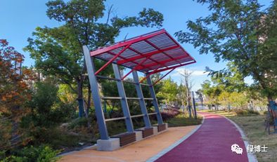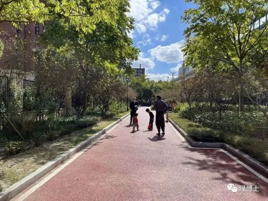 蒲匯塘東側濱水綠道以“鄰里生活”為主題,打破原有圍墻限制,增設健身設施及休憩場所,采用色彩明快的透水鋪裝串聯各場景空間。