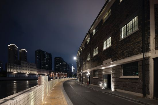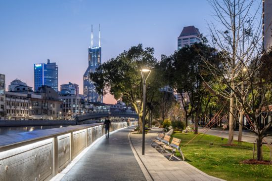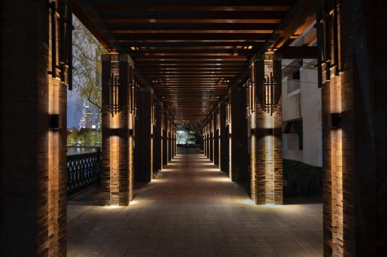 為了充分考慮以改善人居環境、吸引更多人到夜晚的蘇州河靜安段來的目標,蘇州河靜安段在沿岸道路照明采用防眩光、避免光污染的優質洗墻燈、投光燈,不但滿足了夜間道路照明的需求,同時與夜晚河靜謐流淌的蘇州河相輔相成,沿岸的燈光倒影在河中,還人們一個舒適又靜謐的夜色。