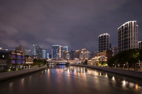 在蘇州河靜安段的亮化工程,通過系統化的照明設計,以更加節能環保的方式,提升周邊居民的生活質量,美化城市形象。每當夜晚到來,華燈初上之時,走進靜安區,遠望蘇州河,可以看到河水映照著兩岸的燈光,清風徐來,粼粼波光應和著堤岸的光影律動,星光點點與河中倒影交相輝映,演繹著江南山水云煙繚繞、水波蕩漾、層層疊疊的朦朧意境。