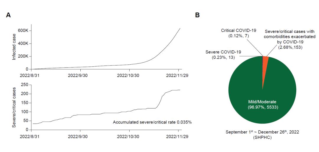由于抗擊新冠感染的任務已經轉為防治重癥為主,研究團隊依據公開信息,對此波疫情截至2022年11月29日的重癥/危重癥患者數和感染者總數變化情況進行分析,發現重癥/危重癥人數隨感染者人數增長而增加,比例達到0.035%。