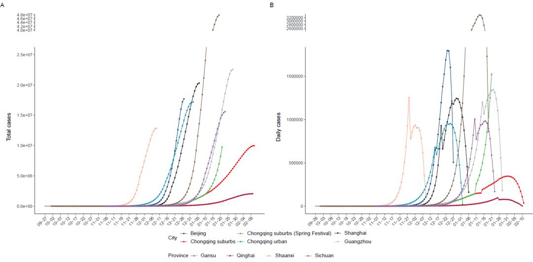 然而,基于重慶市主城區和郊區數據的數學模擬分析,提示疫情峰值在郊區有所延后,且其感染峰值將在春運期間因疫情擴散加速而顯著增強。對于四川、陜西、甘肅、青海等省,在不計省會城市人群疫情進展情況進行預測,估計在農村和中小城鎮地區的感染峰值將于2023年1月中下旬出現,由于春運原因,這些峰值也可能提前到達。