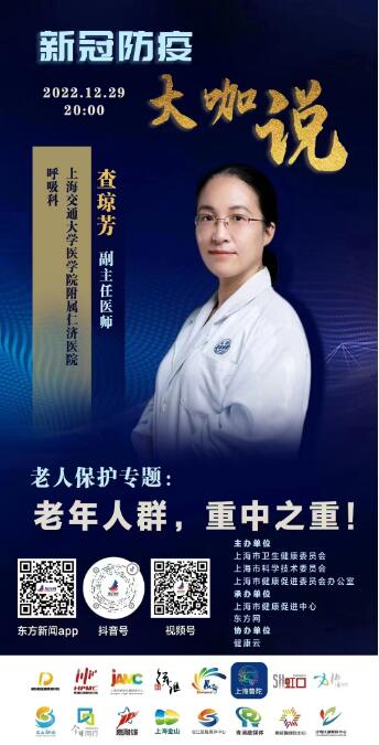 12月29日晚,上海交通大學醫學院附屬仁濟醫院呼吸科副主任醫師查瓊芳帶來一場“老年人群,重中之重!”的在線直播講座。這是由上海市衛生健康委員會、上海市科學技術委員會、上海市健康促進委員會辦公室主辦,上海市健康促進中心和東方網聯合承辦的“新冠防疫大咖說”系列直播活動的第四場,且看大江東工作室的持續關注。