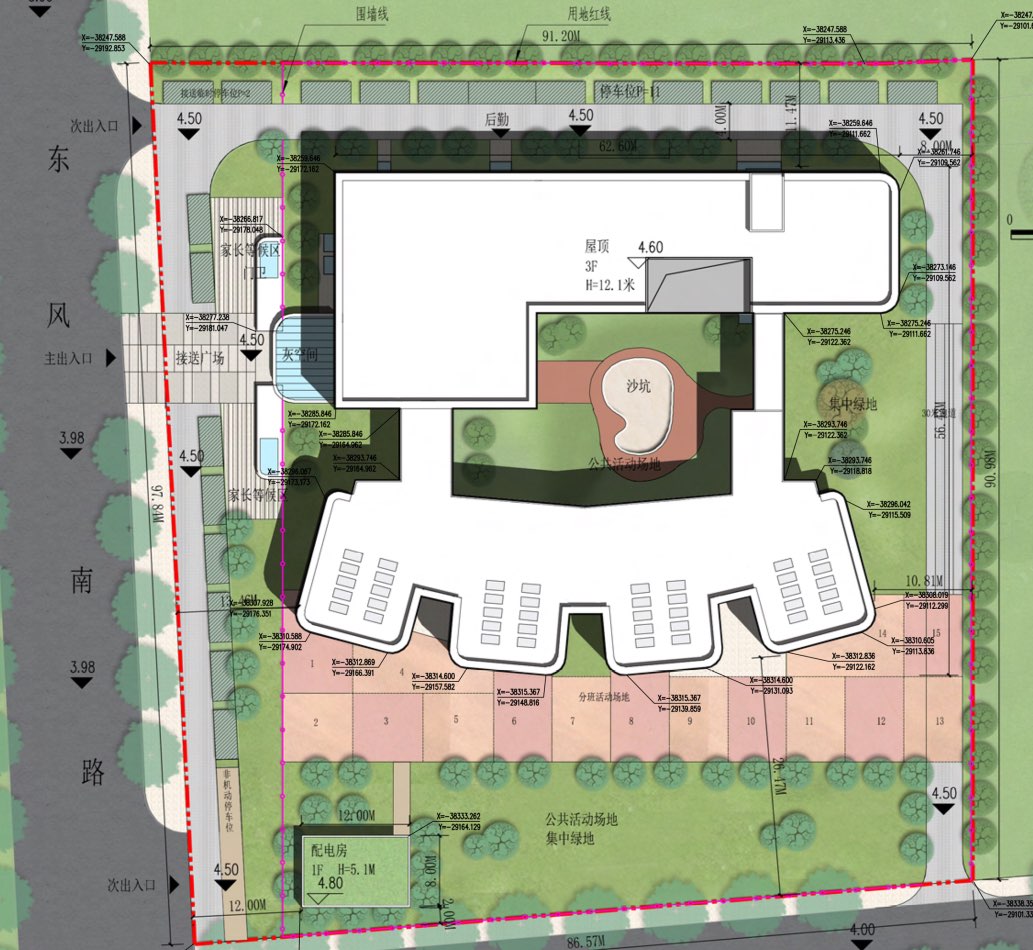 教學樓主樓共三層,由晨檢、廚房、教師辦公、生活單元、多功能廳、活動室、專用教室、輔助用房等空間組成。主入口設于西側,沿東風南路退讓出寬12米,長97米左右的接送廣場,這將極大緩解放學時的交通壓力,并設有等候風雨廊,可以讓家長在此休息等待。