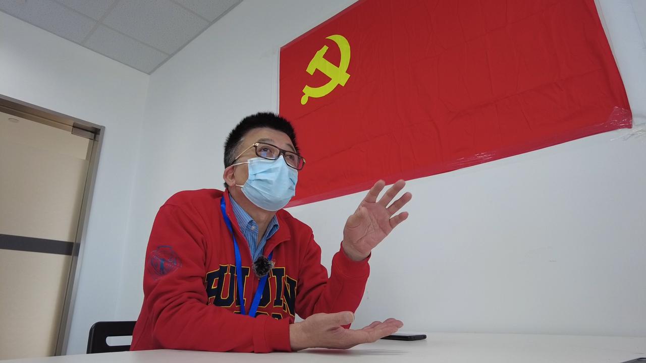 2022年4月6日,陳爾真在“四葉草”方艙接受大江東采訪。顧海民攝