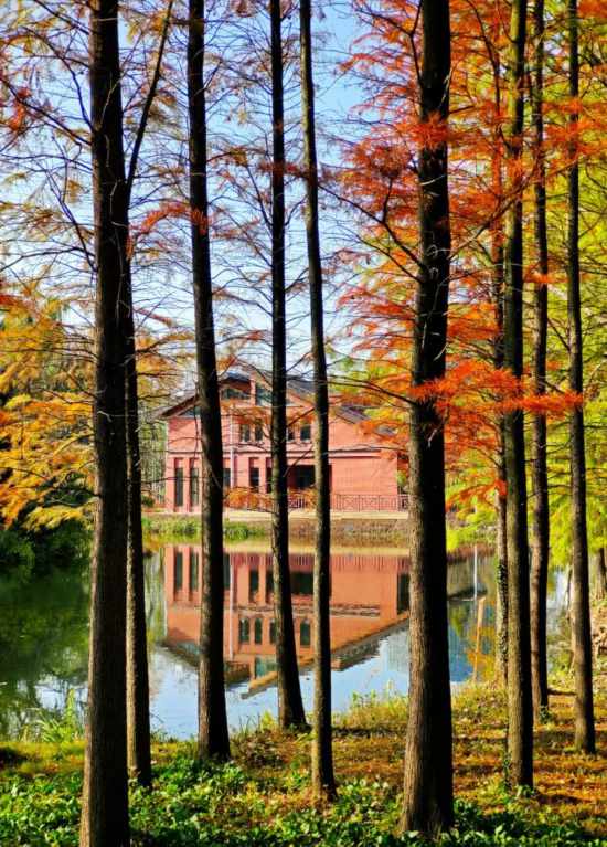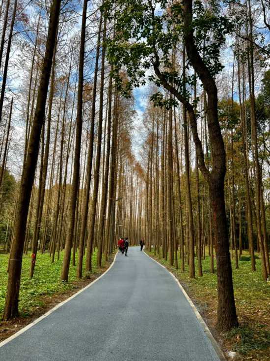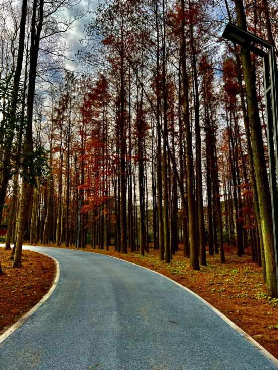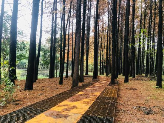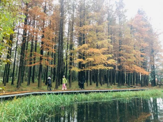 園中林間小路及棧道鋪設充分做到“遇樹就改路,路給樹讓步”,有樹的地方調整園路走向。增設濱水與水杉林下棧道時,選取更加結實耐用的耐候鋼,并且顏色與大地接近,與環境更契合。路面則鋪設鋼格網,植物可透過網格向上生長更顯野趣和諧。