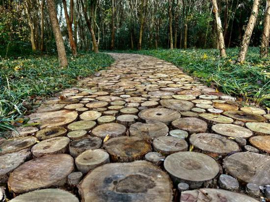 “青青一樹,枯枯一路,長條折盡,朝華還復?!?/strong>公園里水系邊有一處森林劇場,是通過梳理植物群落、優化劣生植被形成的一處開敞草坪空間,梳理同時將劣生、干枯、移除等樹種現場回收利用,通過防腐處理及清漆保護措施,改造成自然郊野趣味的木樁園路。