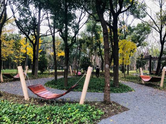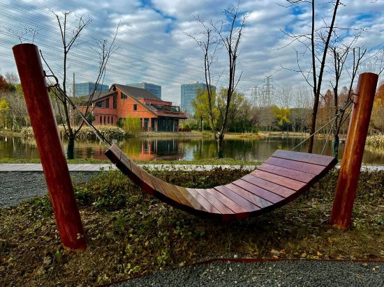 “休閑舒適的林下搖椅”——將濱水植物界面視線打開,置入搖椅互動設施,營造林下休憩與體驗場所;采用礫石鋪裝,強化雨水下滲與海綿屬性,也增強生態森林的自然郊野感。