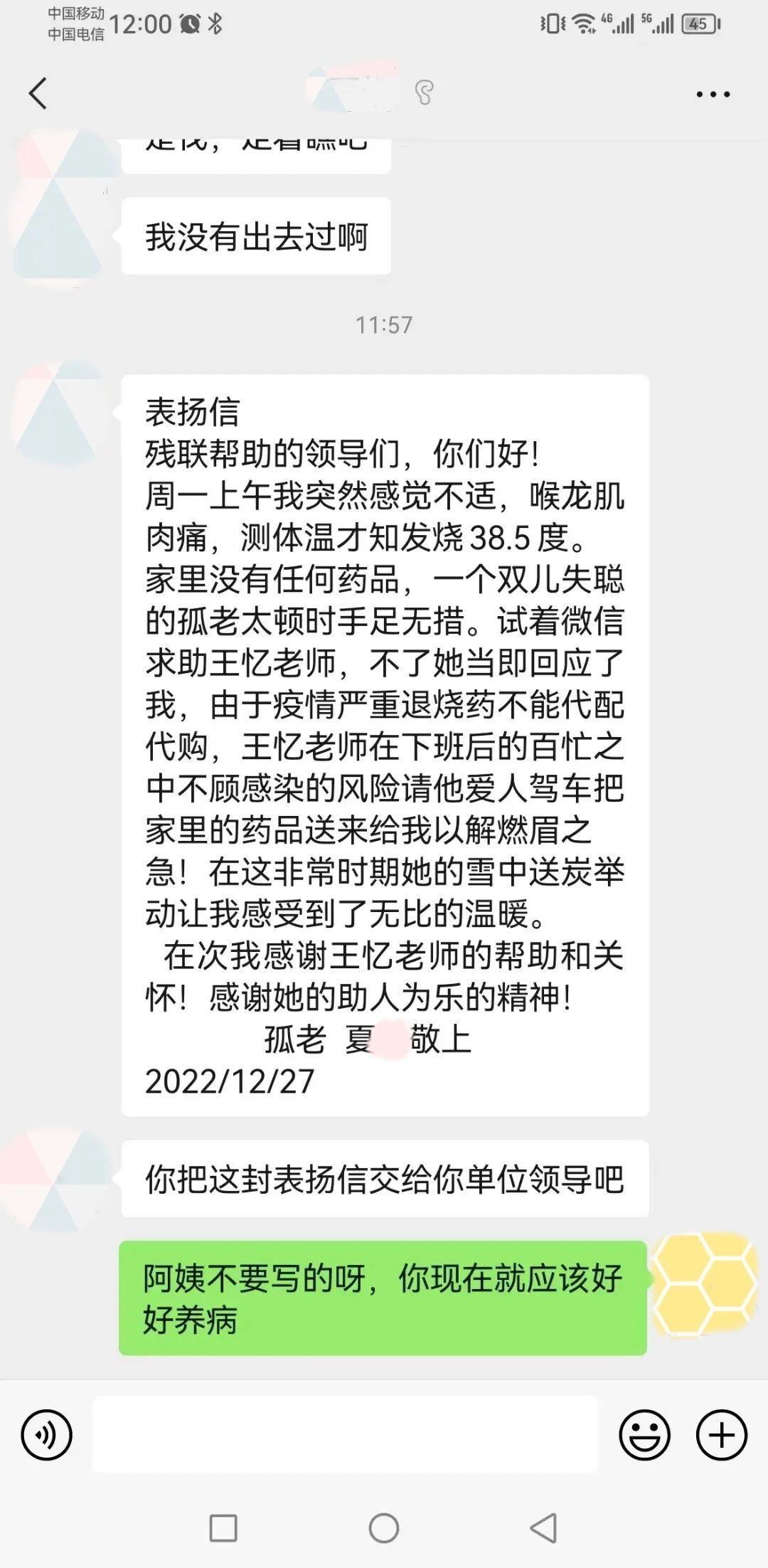 日前,虹口區殘聯收到一封來自曲陽路街道玉田路432弄一位殘疾孤老的感謝信。原來,受此輪新冠疫情影響,68歲的夏阿婆也“中招了”。幾天前,老人獨自在家,突然感覺喉嚨劇痛,高燒38.5度,家里沒有備下任何退燒藥,她頓時手足無措。由于聽力一級殘疾,不方便與人打電話,她試著通過微信求助居家無憂平臺的一位工作人員王憶,沒想到,在無法代配退燒藥的情況下,王憶冒著可能被感染的風險,將自家準備的藥品給老人送上了門,解了老人燃眉之急。吃下退燒藥,夏阿婆感覺身體好多了,她趕緊寫了一封感謝信給虹口區殘聯,感謝殘聯提供的居家無憂服務平臺,感謝工作人員王憶的及時相助,為她解除了病痛。