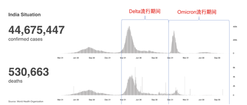 上圖可見印度感染不同毒株時的峰值:印度流行的德爾塔毒株感染峰很高,而奧密克戎變異毒株的感染峰出現得就很晚(相隔一年),且感染峰值很一般。