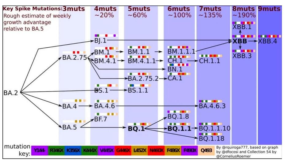 從上圖可見,當前在歐美地區以及中國流行的幾大毒株,都是由BA.2變異而來。徐建青教授分析,XBB.1不會比Omicron BA.2造成更大震蕩,因為它是在BA.2的基礎上出現的;同時,疫苗接種與本輪的BA.5.2/BF.7感染誘導的T細胞應答和抗體應答所形成的免疫屏障,對后續的XBB.1的流行將產生重大影響。