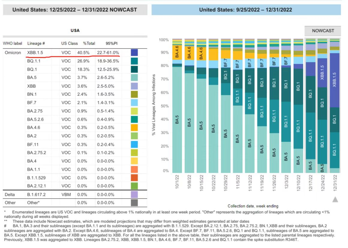 美國的現實情況是,截至2022年12月25日-12月31日,雖然XBB1.5和BQ.1/BQ.1.1感染比例很高,但是,實際上是在一個小的人群中流行,并不是全民再感染一遍。