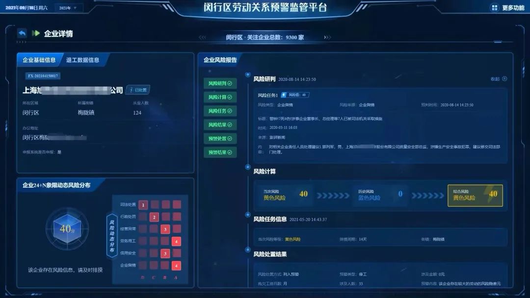 據了解,今年年初,閔行搭建了全市首個勞動關系智慧預警管理平臺,通過接入大數據中心,對企業的司法處置、行政處罰、勞動用工等6個維度的不同風險因子數據進行分析和“打分”,著力于實現勞資矛盾的精準預判。