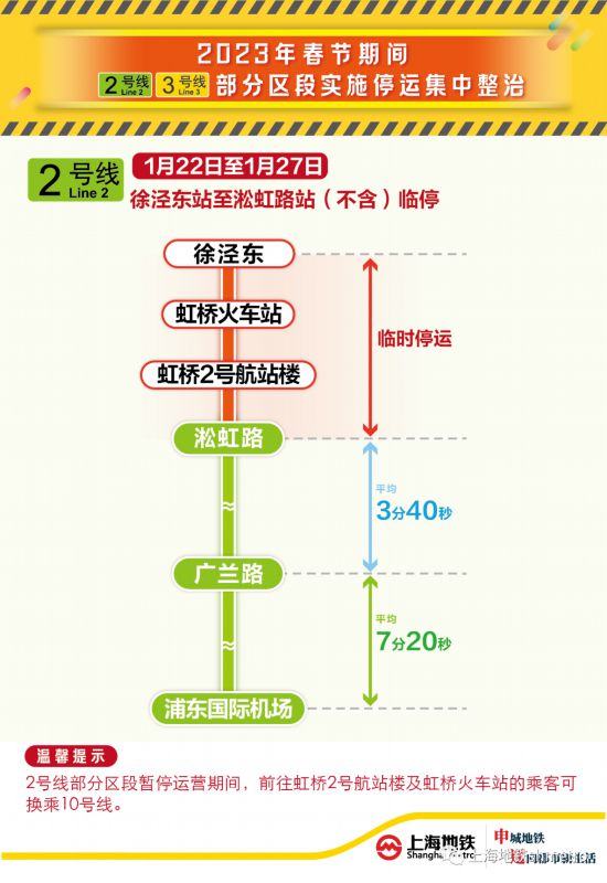 為充分利用春節客流低谷開展線路設施改造和安全整治,2023年1月22日至1月27日(年初一至初六),上海地鐵2號線徐涇東站至虹橋2號航站樓站區段將臨時停運施工,涉及的3座車站將臨時封站,2號線全線將調整為“淞虹路站至廣蘭路站/淞虹路站至浦東國際機場站”大小交路運行;2023年1月21日至1月27日(除夕至年初六),3號線淞發路站至江楊北路站將臨時停運施工,涉及的8座車站將臨時封站,3號線全線調整為“上海南站站至長江南路站”單一交路運行。在以上兩條線部分區段施工期間,停運區段均將配備免費公交接駁服務。根據計劃,2023年1月28日(節后首個工作日),2、3號線停運區段均將恢復正常運營。