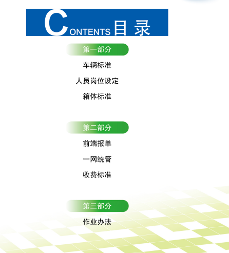 《導則》分為三個部分:車輛標準、人員崗位設定、箱體標準;前端報價、一網通管、收費標準;作業辦法等。各部分都有詳細的介紹。