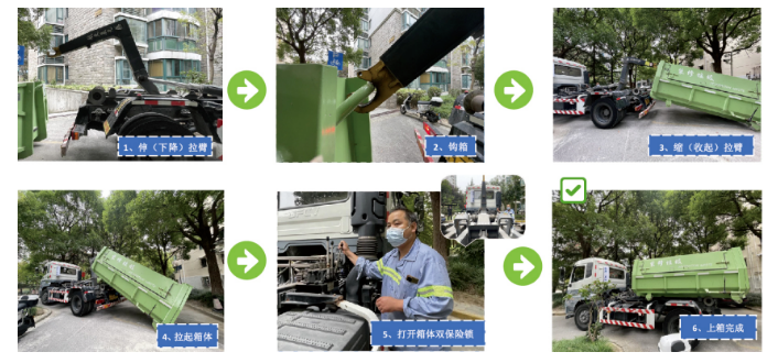 值得注意的是,《導則》對建筑裝修垃圾收集整個作業流程進行了較為詳細的介紹,駕駛員的工作服、車容車貌、隨車作業物品等都有明確規定。尤其是進入小區后,《導則》規定,隨車人員必須下車指揮,配合駕駛人員安全將“綠箱子”放入小區指定位置,做到“一看”、“二察”、“三指揮”。作業完成后,《導則》也要求工作人員對場地進行清掃,做到“一手清”要求。