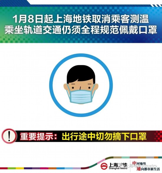 申通地鐵集團提示,根據最新疫情防控要求,自2023年1月8日運營開始起,上海軌道交通所有車站不再對進站乘客進行體溫測量。乘坐地鐵請全程佩戴口罩,同時做好手衛生、保持人際距離、注意咳嗽禮儀。出現發熱等癥狀人員或陽性人員避免乘坐軌道交通。