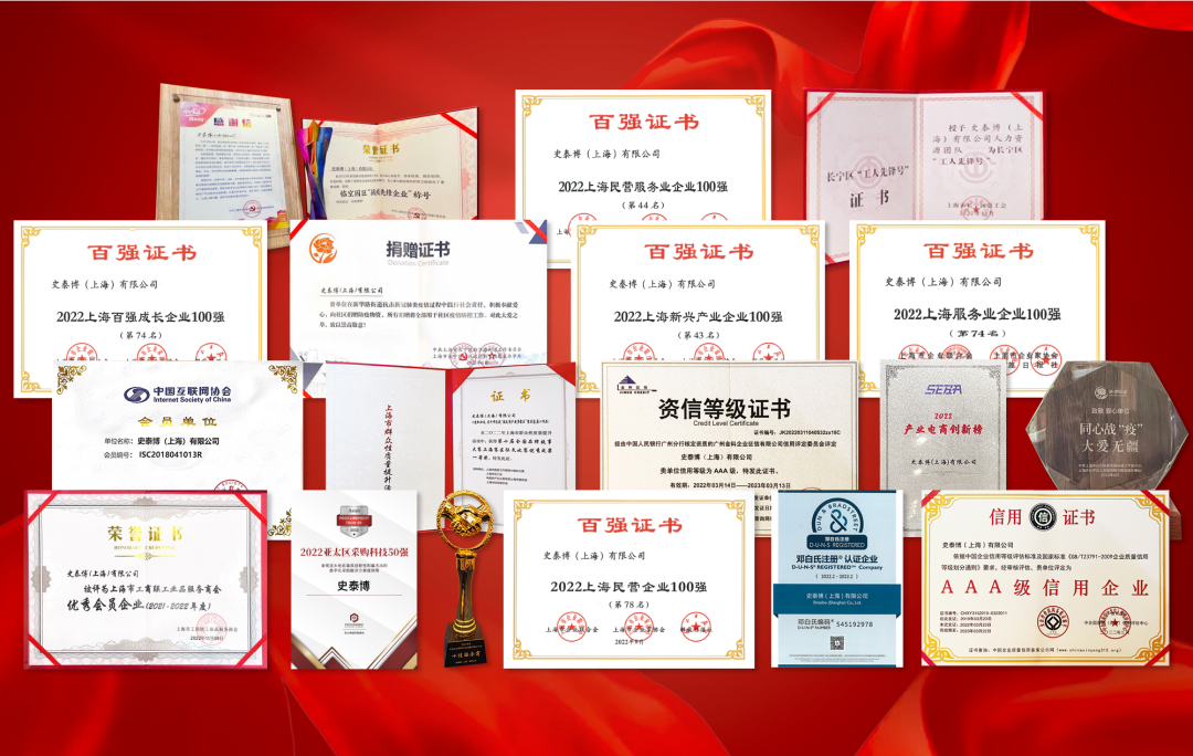 2022年,史泰博在品牌實力、服務交付、科技創新、守信履責等層面屢獲認可,榮膺“2022上海民營企業100強”“2022年3月-2023年3月 中國企業信用等級AAA級信用企業”“2022亞太區采購科技50強”“2022年度中央企業集采供應鏈整體解決方案十佳服務商”“上海市工商聯工業品服務商會優秀會員企業(2021-2022年度)”“2022.2-2023.2 鄧白氏注冊認證企業”等多項榮譽。