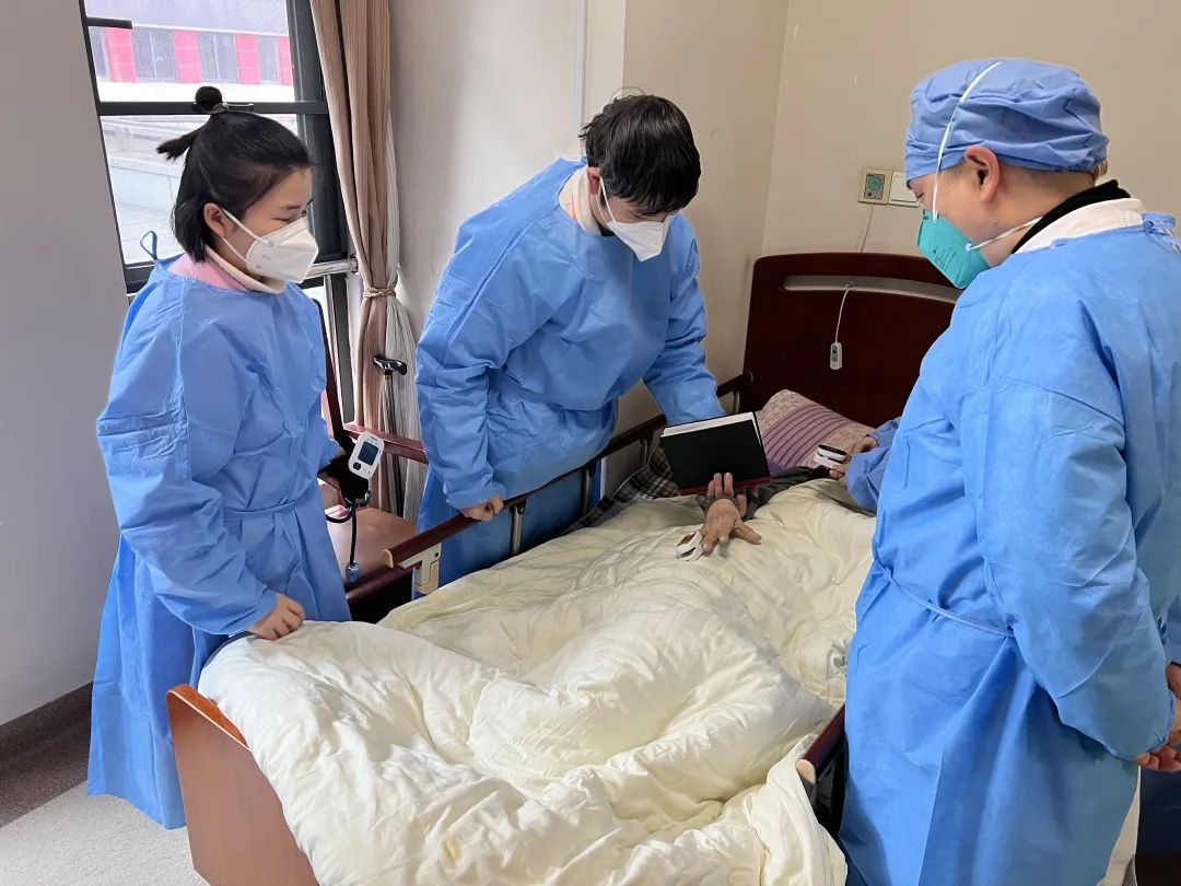 簽約完成后,來自長白社區衛生服務中心的醫療隊來到住養區,現場開展巡診。針對院內新冠陽性感染老人,醫護人員們進行一對一詢問與檢查,評估其健康狀況,判斷是否屬于危重癥、是否需要接受診治。