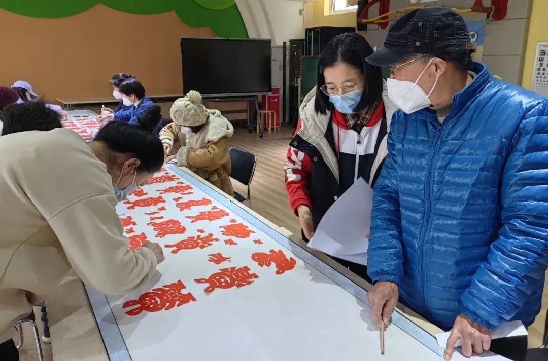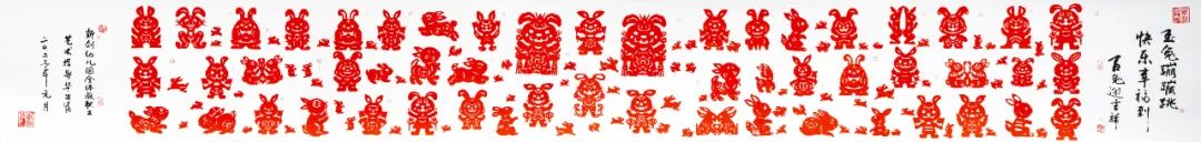 辭舊迎新之際,新涇鎮非遺傳承人華興富帶領新劍幼兒園全體教職工集體創作了一幅《玉兔蹦蹦跳,快樂幸福到》五米生肖長卷,以非遺撕紙的特有方式迎接癸卯兔年的到來。