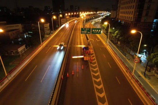 作為上海中心城區主要交通路段,內環高架交通車流量極大,占浦西中心城區快速路車流量(不含外環)54%,在改造期間,如何保證在大流量交通下不斷交施工仍然是此次改造施工的一大難題?;谠谕馊Ω脑熘蟹e累的經驗,上海市道路運輸事業發展中心會同隧道股份上海路橋、城建設計集團在內圈的改造中依然采用了和外圈改造一樣的方案,在市公安局交警總隊的大力支持下,通過“白+黑”分時段作業,每道工序時間嚴格精確到“半小時”,詳細排布進出通道、作業路線,保證了每日準時開放交通,施工全過程做到對交通影響降到最低。
