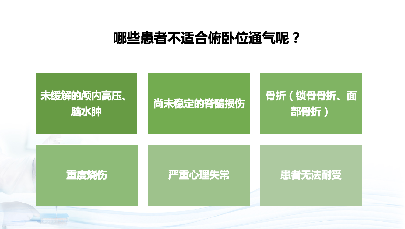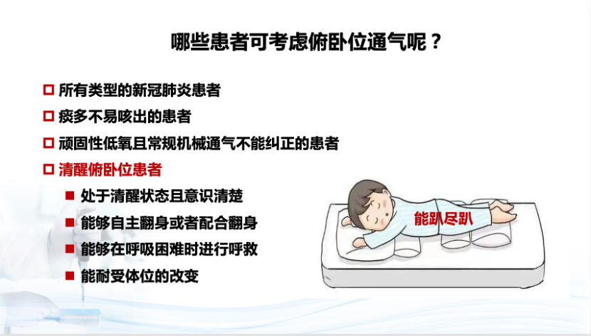 “所有類型的新冠肺炎患者都可使用俯臥位通氣,尤其是痰多不易咳出、頑固性低氧、常規機械通氣不能糾正的意識清醒患者?!钡瑫r強調,“有六類患者不適合俯臥位通氣療法:未緩解的顱內高壓、腦水腫患者、尚未穩定的脊髓損傷患者、骨折(鎖骨、面部骨折)患者、重度燒傷患者、嚴重心理失?;颊咭约盁o法耐受俯臥位的患者”。