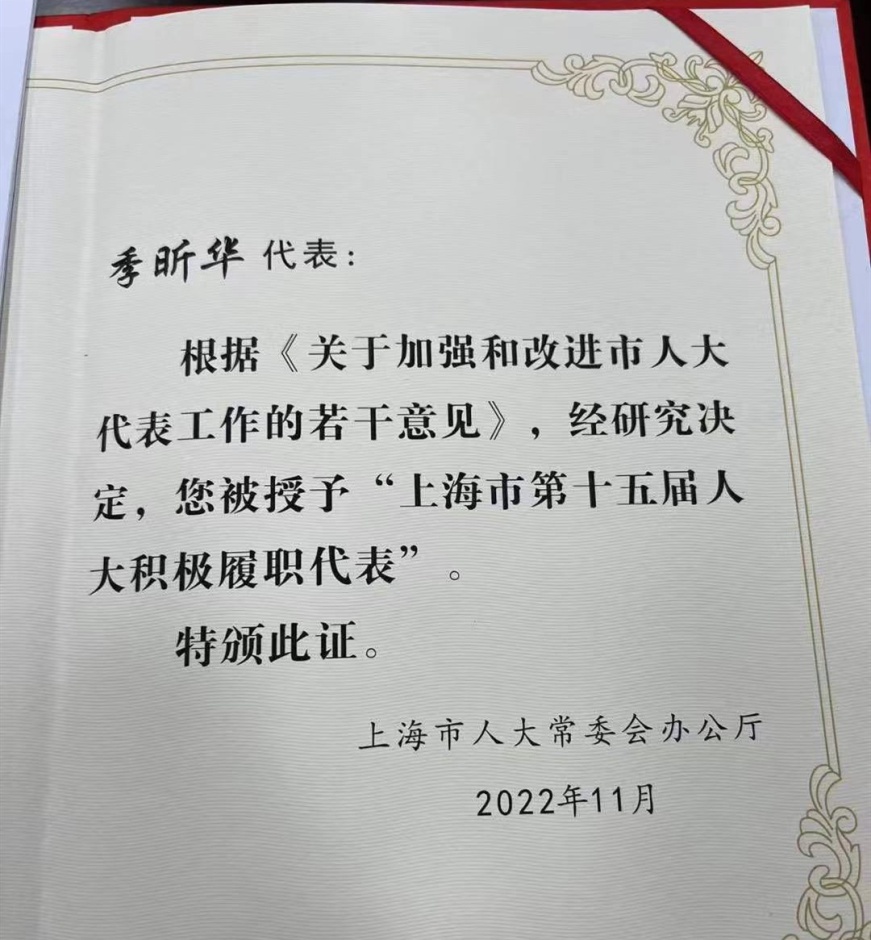 2022年11月,季昕華入選上海市第十五屆人大積極履職代表。對他而言,這不僅是榮譽,更是使命和責任。