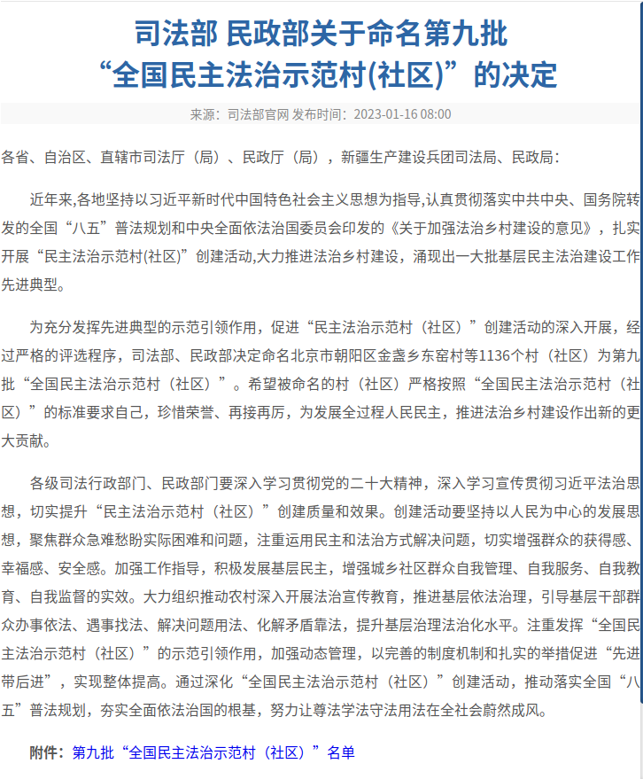 近日,司法部、民政部聯合印發《關于命名第九批“全國民主法治示范村(社區)”的決定》,決定命名全國1136個村(社區)為第九批“全國民主法治示范村(社區)”。其中,金山區朱涇鎮待涇村、漕涇鎮水庫村光榮上榜!