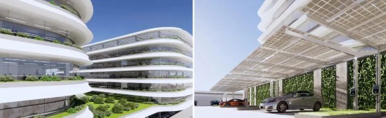 在國家綠色環保及“雙碳”減排的宏觀背景下,該項目積極響應政策要求,通過海綿城市、屋頂綠化、光伏發電等措施,力爭實現綠色建筑三星級目標。建筑利用各層之間的錯位關系打造生態綠谷,創造出看得見摸得著的綠化辦公環境;充分利用屋面停車區的遮陽棚和塔樓屋頂設置太陽能光伏板,既創造了遮陰的空間,又換取了可再生能源。