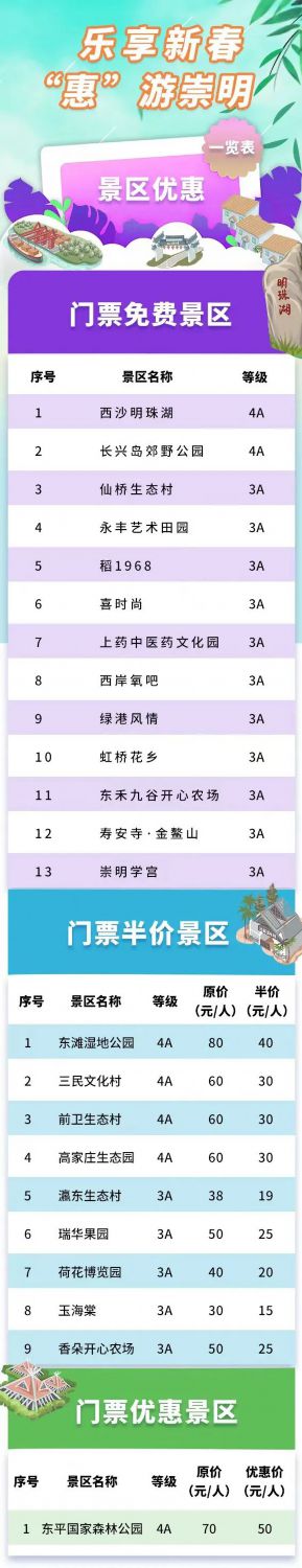 崇明區新聞辦介紹,即日起至2023年2月28日,崇明特推出“樂享新春 惠游崇明”,西沙明珠湖、長興島郊野公園等13個A級旅游景區免費游,東灘濕地公園、三民文化村等9個A級旅游景區半價游。詳見↓