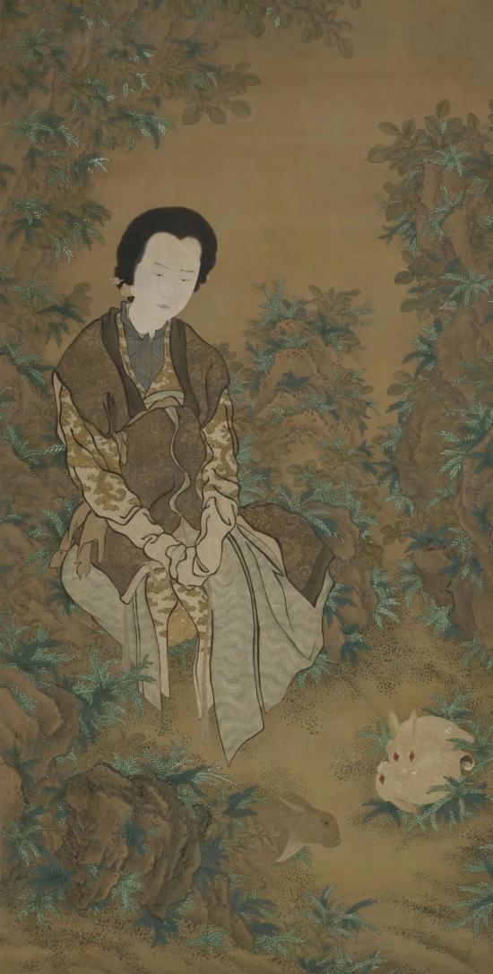 此幅作叢石草木,麗服仕女,獨坐觀兔。人物衣紋虬勁,多有提捺,花紋繁復,刻畫細密,設色勻薄。足邊三兔,似在嬉戲玩耍,兩白一黑,毫毛畢現,情態可掬。