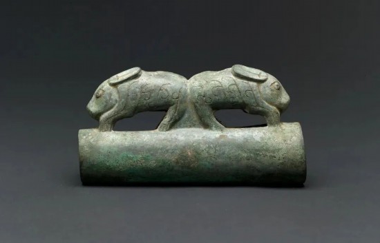 車衡通常為一根圓柱形的木棍,其主要功能是縛軛駕馬。這件器物的主體呈空心圓筒狀,用于插入木衡起到穩固和裝飾的作用。雙兔立于圓筒之上,作反向奔跑狀,俯首曲肢,圓目長耳,臀部相連,腹部兩側裝飾有云紋。這件車衡飾鑄造精良,雙兔形象寫實,造型生動活潑,是西周青銅車馬器中的精品。