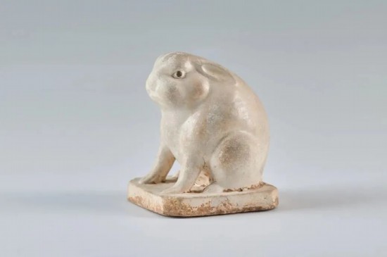 這件白釉兔,兔蹲踞于八邊形臺座之上,昂首前視,雙耳后抿。通體施白釉,臺座底部露白胎微泛黃,兔眼點褐彩。鞏義黃冶窯窯址曾出土造型相近的素胎殘件,結合胎釉特征判斷此件器物當屬鞏義窯產品。