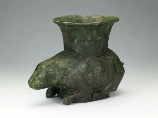 這件青銅兔尊與上博青銅展廳中著名的晉侯酥(音同酥)鐘來自同一位晉侯。兔作匍匐狀,雙目前視,兩耳向后并攏,四腿蜷曲,腹部中空。兔身兩側飾三層依次凸起的圓形紋飾,由里向外依次是渦紋、四目相間的斜角雷紋和勾連雷紋。以兔作為尊的器形,在青銅器中尚屬首見。