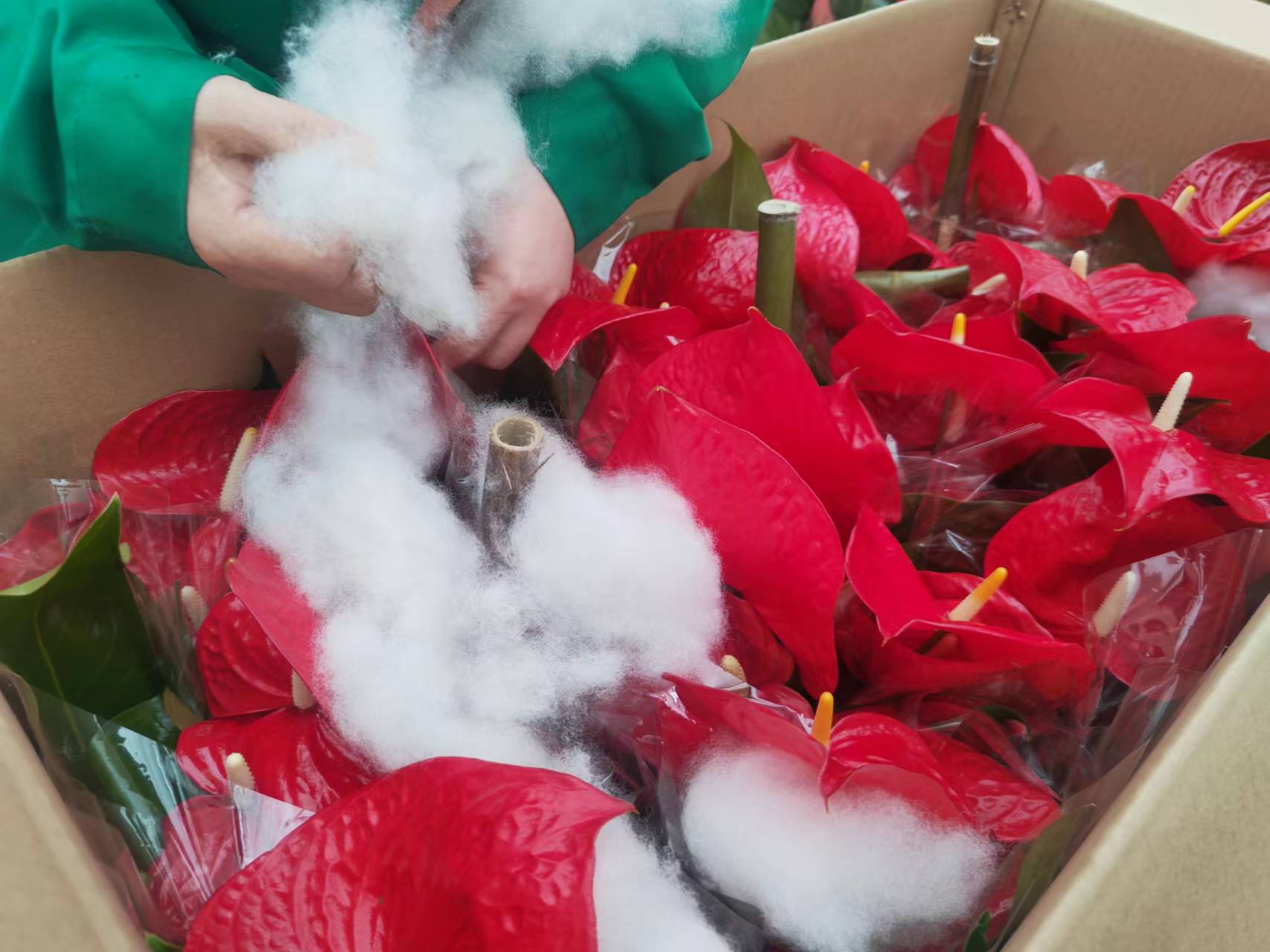 光明花卉集團生產基地內,工作人員給裝箱的紅掌塞入填充物,防止物流顛簸導致的損傷