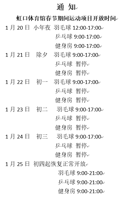 1月17日起,虹口體育館(精武體育館)內的羽毛球場、乒乓球館、健身房等場館已全面恢復運營!長假期間,部分場館還對外開放哦~