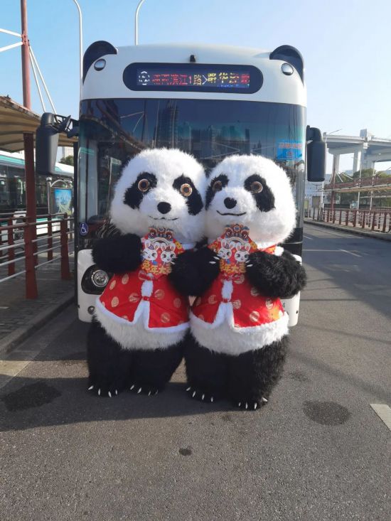 在巴士四公司浦西濱江一路終點站,兩只憨態可掬的熊貓“濱墩墩”身穿紅色禮服,手持“兔年吉祥”給乘客拜年啦~