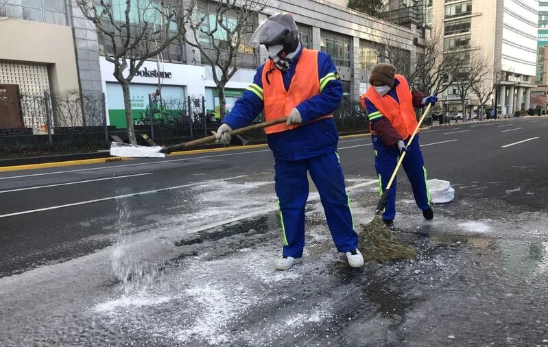 “寒潮”期間,2萬余名環衛工人堅守崗位,共出動應急保障隊伍197支、人員4142人次、車輛384輛次,使用麻袋及草包8581個、融雪劑及工業鹽21.95噸、黃沙1.9噸,去除路面冰雪和積水,確保安全暢通。
