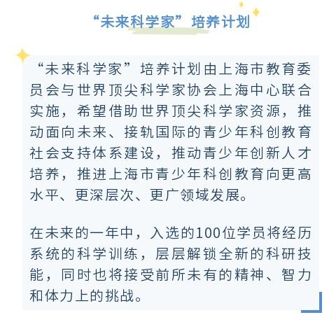 新年里傳來新喜訊,前不久,一份由100位上海青少年組成的“未來科學家”培養計劃學員名單公布了!這份名單由上海市教育委員會和世界頂尖科學家協會上海中心聯合發布,入選的學生是在全市范圍內遴選出的具有科學素養和創新潛力的“未來科學家”!