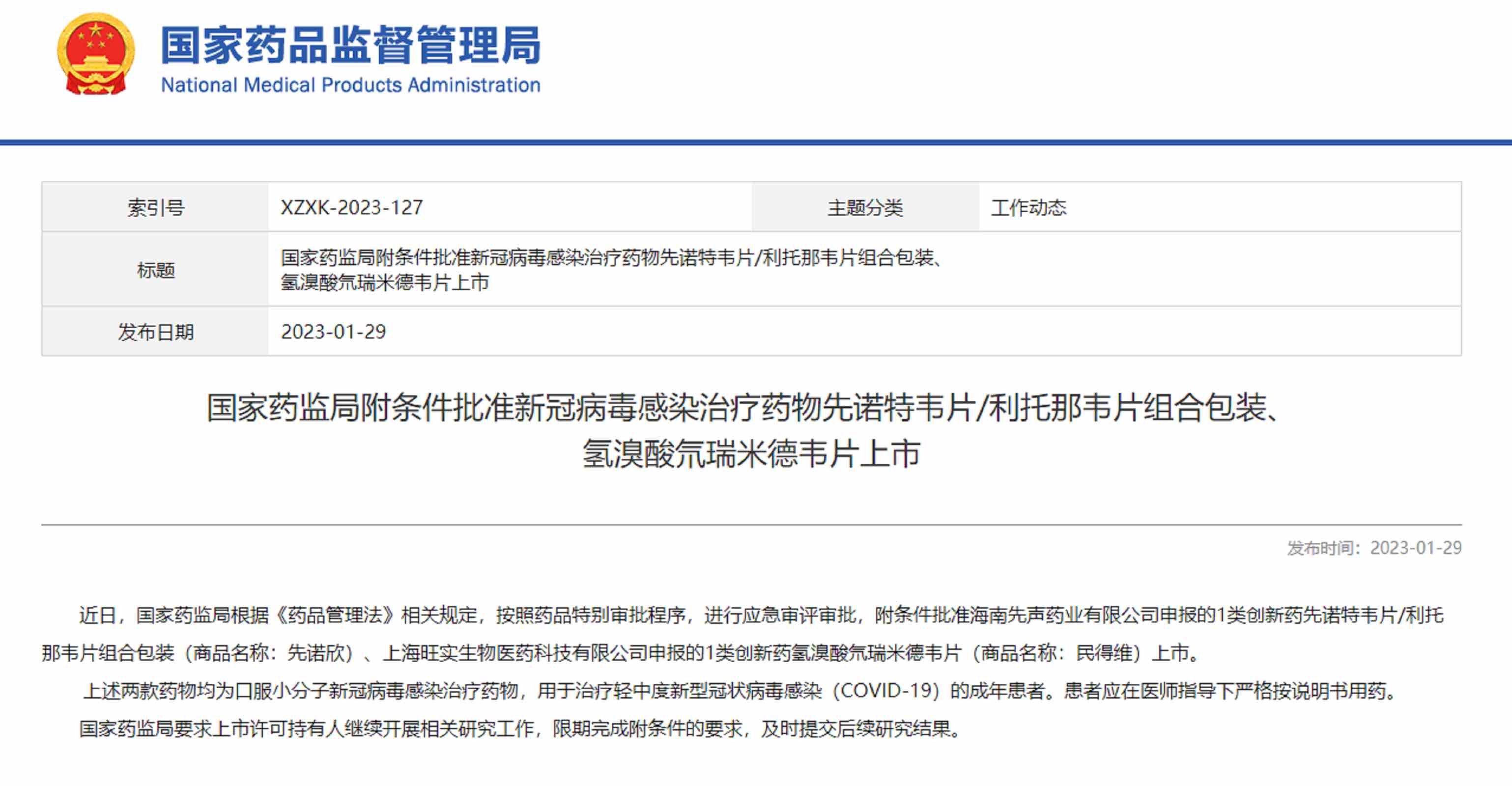 上海市藥監局1月29日宣布,國家藥監局根據《藥品管理法》相關規定,按照藥品特別審批程序,進行應急審評審批,附條件批準上海旺實生物醫藥科技有限公司申報的1類創新藥氫溴酸氘瑞米德韋片(商品名稱:民得維)上市。
