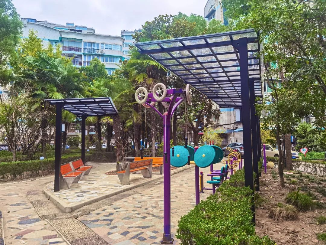 去年秋末冬初,嘉興路街道在飄鷹花苑小區花園實施了微更新。原先的石凳冷冷清清,照明幽暗老舊,現在,不僅增加了長凳,還根據居民意愿,在休息區域和健身區域設置了透明頂棚,加裝了照明燈?;▓@變得更加舒適、安全、整潔。