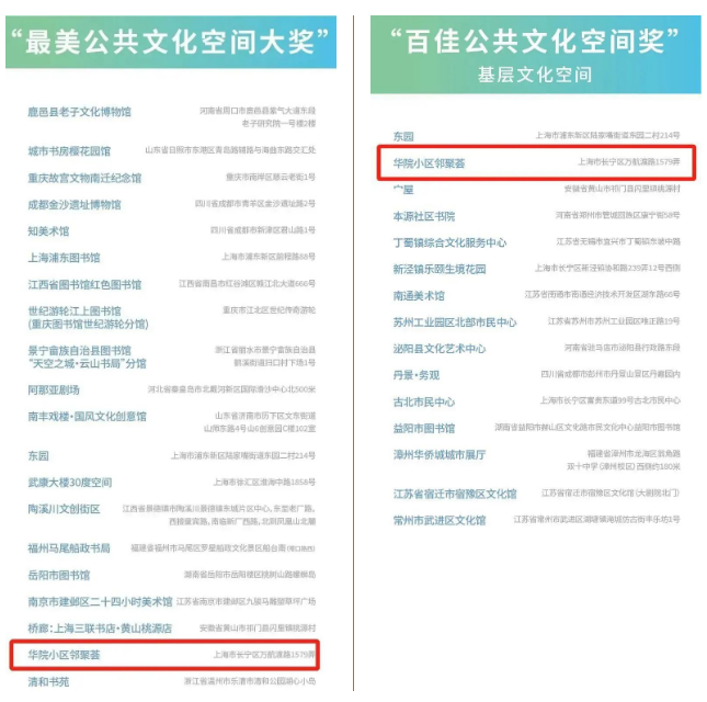 2022年長三角及全國部分省市最美公共文化空間大賽獲獎名單日前公布,華陽路街道位于蘇州河邊的華院小區鄰聚薈斬獲“最美公共文化空間大獎”、“百佳公共文化空間獎”和“網絡人氣獎”三項榮譽。