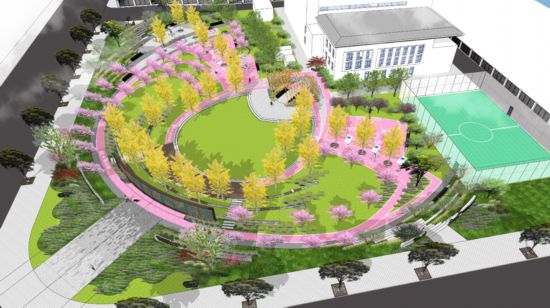 在街心花園設計上,提取蓮的形象,整體結構為蓮花形狀,用一條蓮花粉的健身步道勾勒出來,未來還將種植晚櫻,落櫻繽紛,粉嫩傾城,打造網紅打卡點,吸引更多年輕人聚集,激發場地活力?;顒訁^內的設備為蓮葉形狀,地形為層層漣漪,并以小蝌蚪歷險記為主題,打造趣味景觀。在色彩運用上,將持續選用蓮花的粉色與蓮葉的綠色,讓蓮花之美浸潤至花園的角角落落。