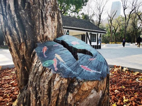 這些樹洞畫每一組都有它們各自的故事。在英式園門前,一幅栩栩如生的“蓮蓮有魚”樹洞畫就在公園門口歡迎各方來客,不同顏色的鯉魚歡快地游動,畫面活潑有趣;一處樹洞較高,且斷面不平整,繪畫師利用形狀創作了“精衛填?!?;沿著萬航渡路繼續朝著梧桐廣場向前走,一路還會遇到“九色鹿”“年輪”“柿柿如意”等樹洞畫,每一幅都讓人眼前一亮。